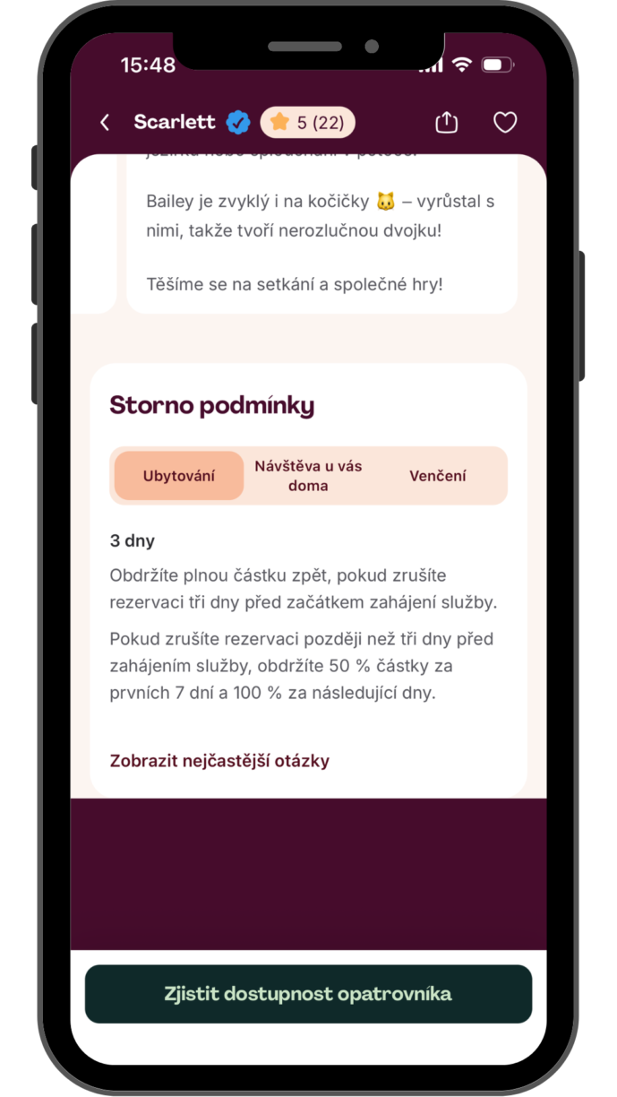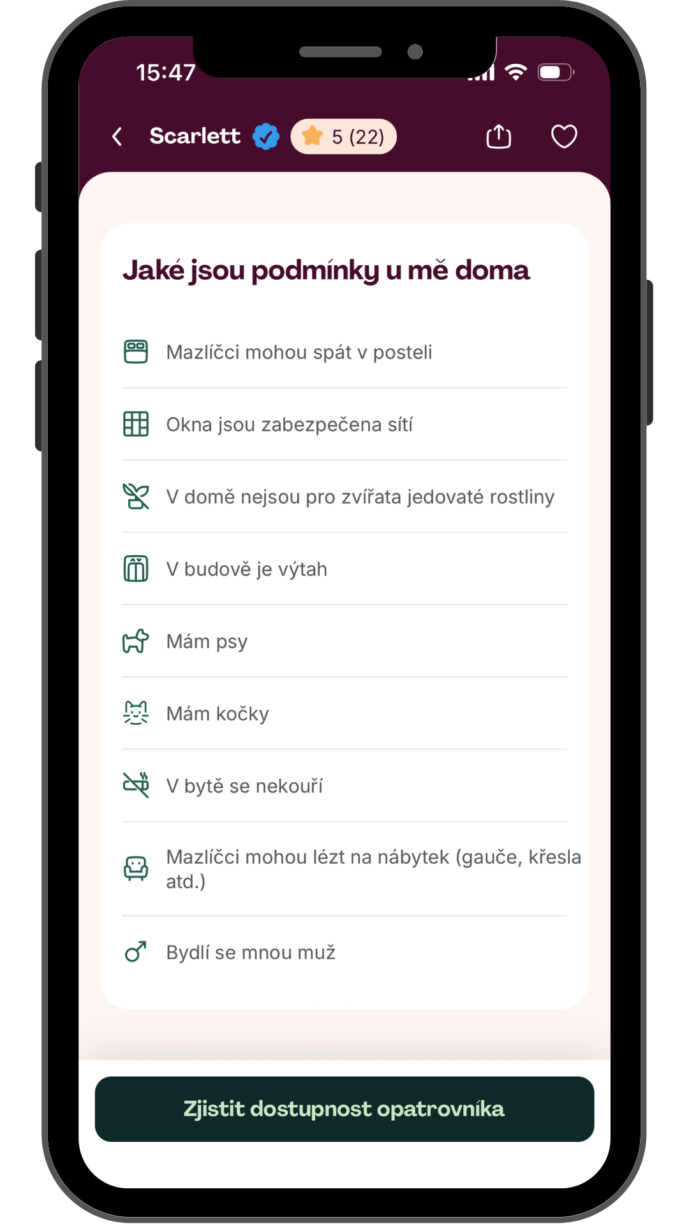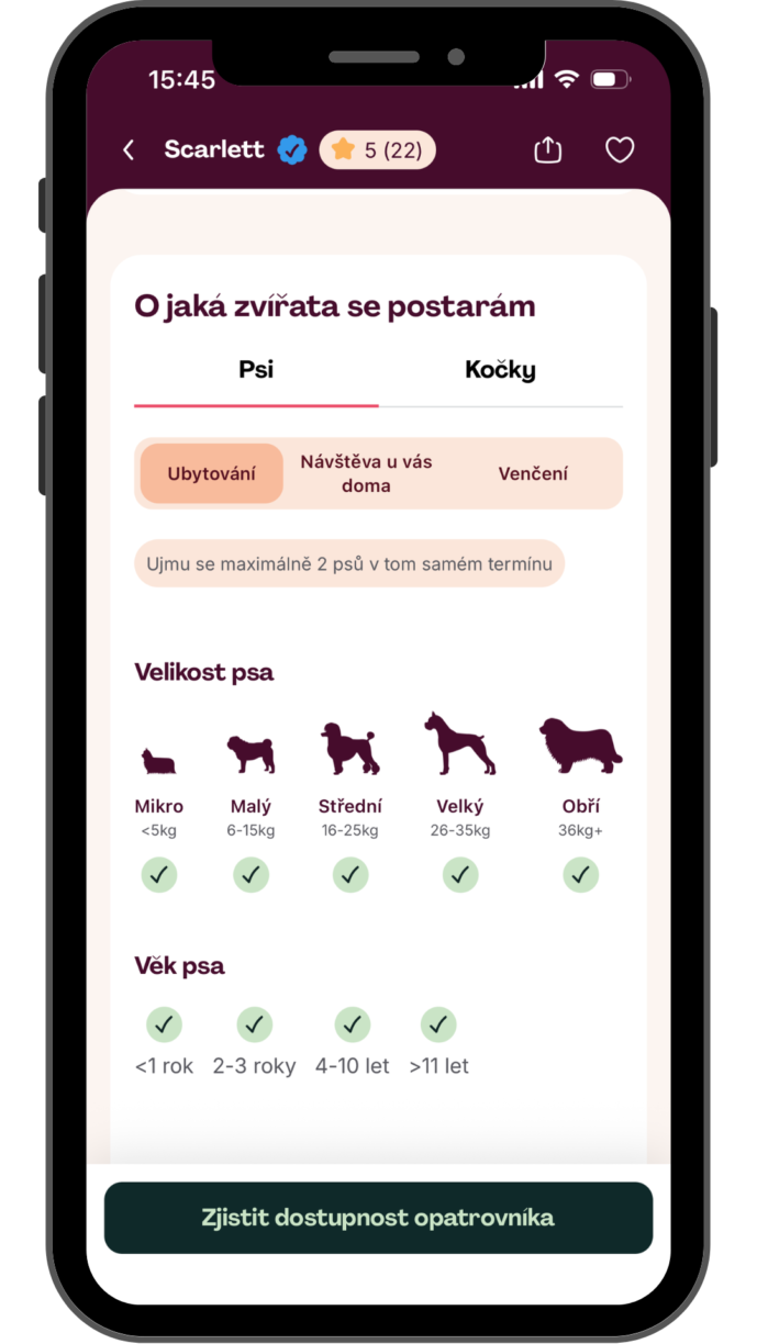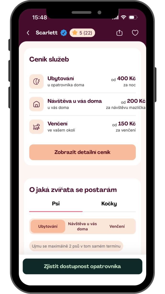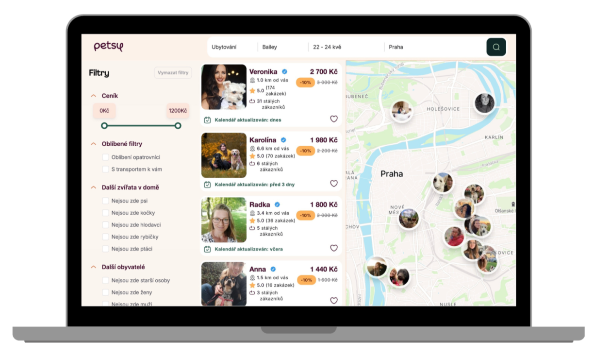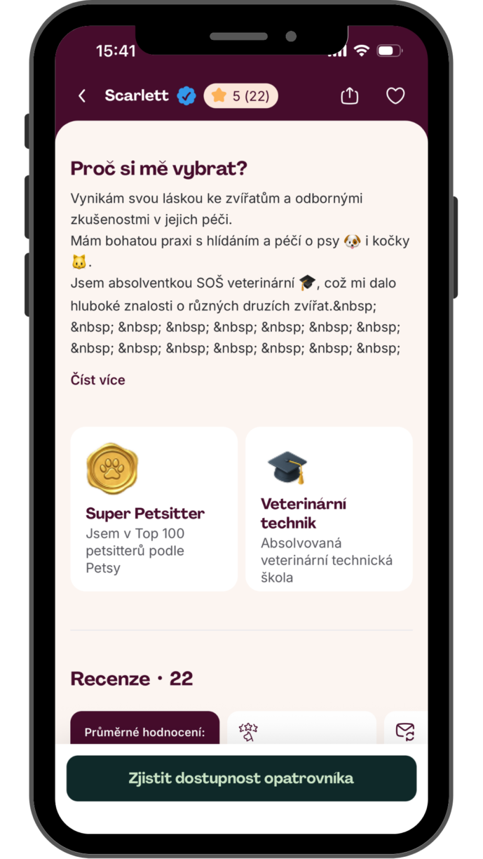 Představujeme novou aktualizaci Petsy. Změny jsou dostupné ve webové verzi, v mobilním prohlížeči i v aplikaci. Nejde pouze o vizuální úpravy, ale o promyšlený posun v designu a funkcionalitě, jehož cílem je zlepšit každodenní práci jak klientům, tak opatrovníkům. Zaměřili jsme se na to, co nejvíce ovlivňuje efektivitu platformy: rychlé porozumění profilu, snadné ověření dostupnosti a méně nedorozumění v komunikaci. Zavádíme řadu změn, které zlepšují čitelnost profilů opatrovníků, usnadňují kontakt a zvyšují přehlednost informací – jak pro majitele mazlíčků, tak pro samotné opatrovníky.