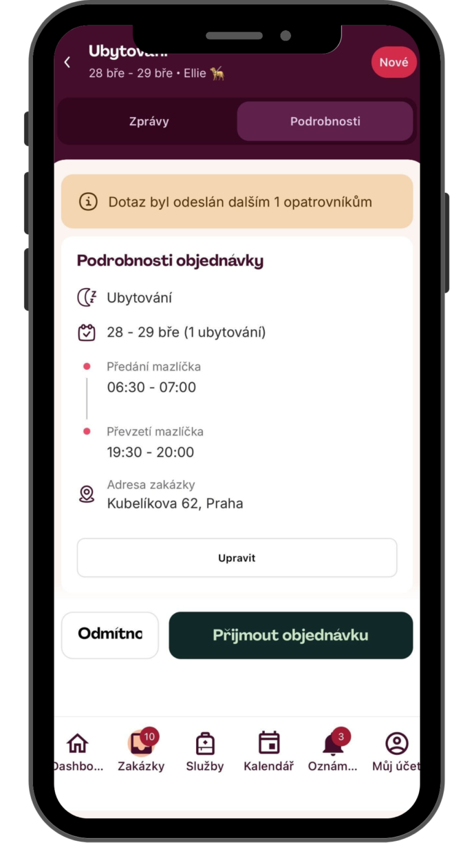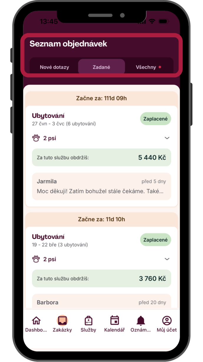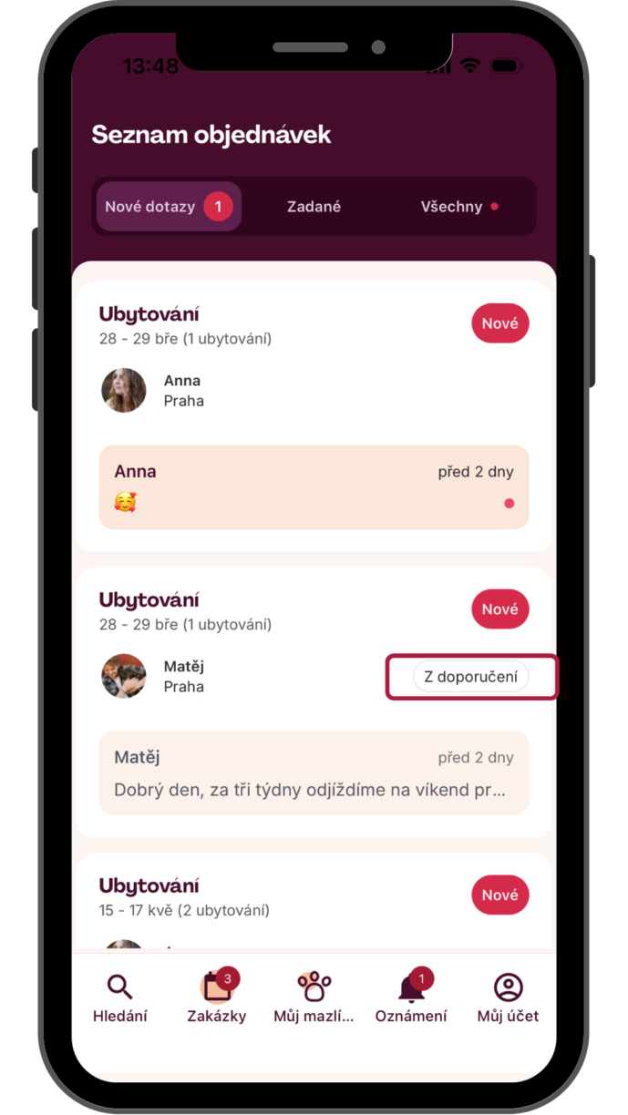 Díky tomu se může rychle vrátit k rozpracované komunikaci. Přidali jsme také označení „z doporučení“, které informuje, zda byla poptávka odeslána přímo konkrétnímu opatrovníkovi, nebo prostřednictvím návrhů. Viditelné jméno a fotografie opatrovníka usnadňují orientaci v aktivních zakázkách.